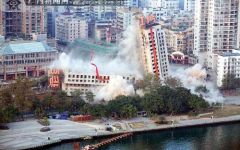 12月30日下午,柳州市柳江路2号高层公寓以“双响炮”方式爆破拆除。不料,这栋22层高的大楼起爆后,只有西半部楼体倒塌,而东半部则被炸成了“斜塔”。