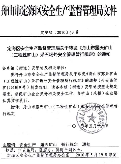 转发《舟山市露天矿山(&金年会官方登录性矿山)采石场外安全管理暂行规定》的通知