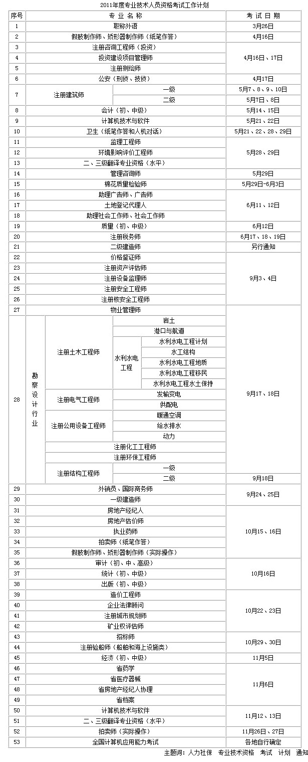 为进一步做好专业技术人员资格考试的计划和管理工作,根据人力资源和社会保障部办公厅《关于2011年度专业技术人员资格考试计划及有关问题的通知》(人社厅发〔2010〕90号)精神和我省专业技术人员资格考试的实际情况,经与我省有关部门共同研究,制定了《2011年度专业技术人员资格考试工作计划》。现印发给你们,如因特殊情况需要变更考试日期的,将提前另行通知请各地、各有关部门按照计划抓紧准备,认真做好组织实施工作,确保各项考试工作安全顺利进行。