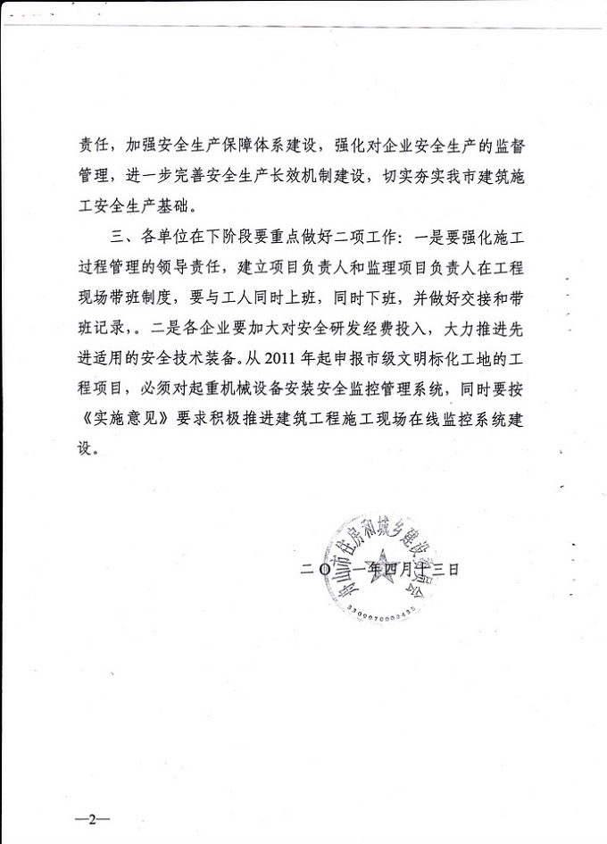 关于“进一步加强建筑施工领域企业安全生产工作实施意见”的通知