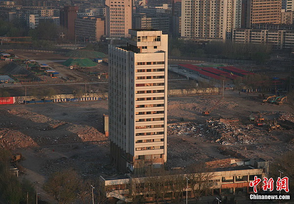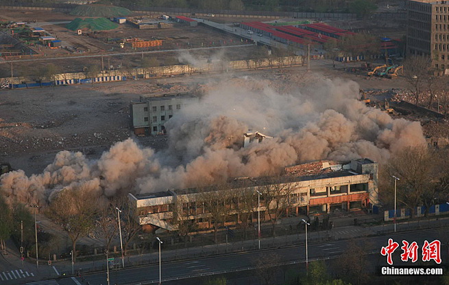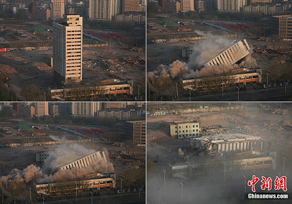 4月28日清晨5时30分,随着一声巨响,位于沈阳市青年大街与文艺路交叉路口的18层56.7米的辽宁科技馆大楼爆破成功,原址将建全国首个体验式文化广场。黄金昆 摄 图片来源:CNSPHOTO