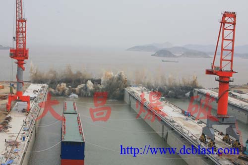 2009119上午10点,浙江东邦修造船有限公司30+10万吨船坞围堰成功爆破拆除。该围堰长约220,围堰体量约8万立方米。爆破点距最近需保护混凝土坞墩约1,属A级爆破。